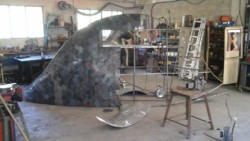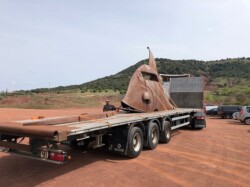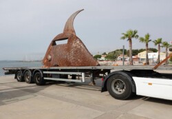 Long de 8 mètres, haut de la moitié et accusant près d’une tonne et demie sur la balance (aïe ! aïe ! aïe ! ça fait mal !), un drôle d’animal couvert d’écailles trône au bord de la lagune, à Mèze, dans l’Hérault.